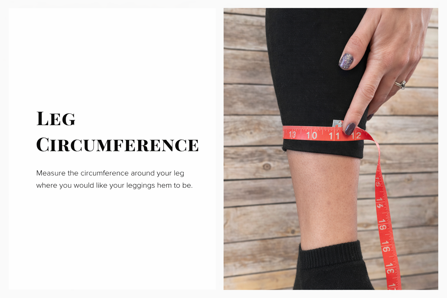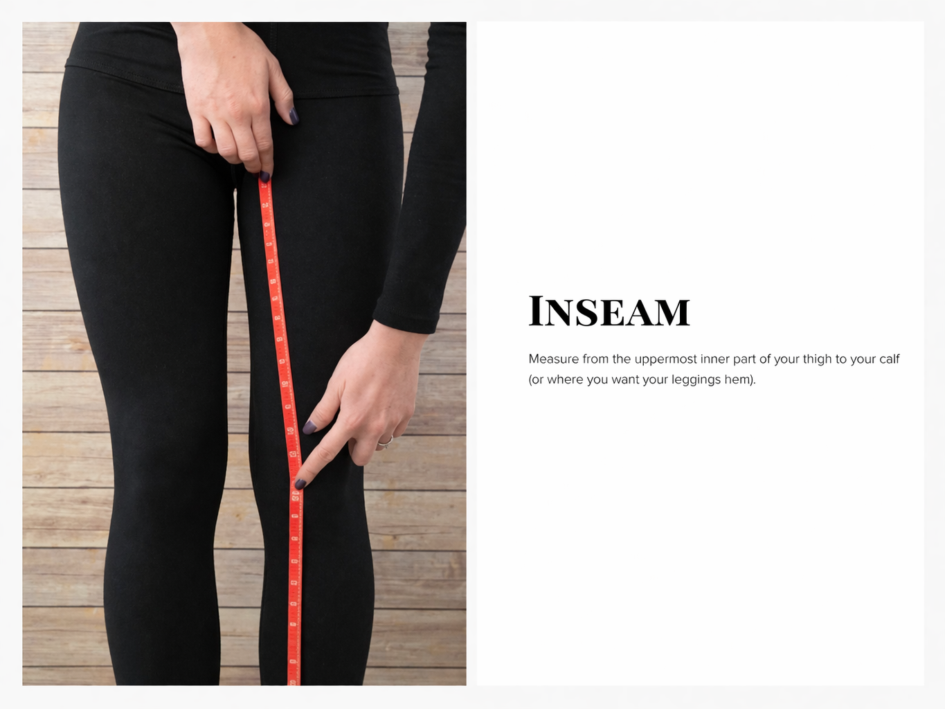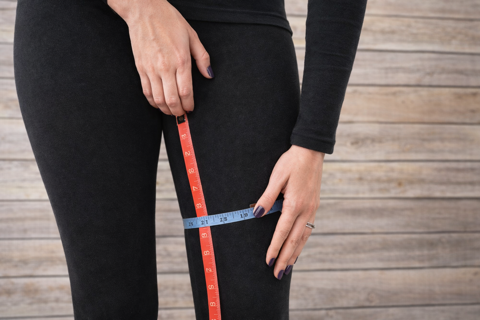 Starting at the uppermost inner part of your thigh (just like you measured your inseam) measure down 6 inches as shown with the red tape, then wrap the tape measure around your thigh as shown on the blue tape. The blue tape will be the circumference of your thigh.